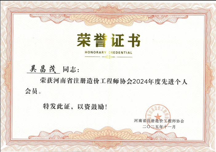 | 近日,河南省注冊造價工程師協會正式公布2024年度會員和個人會員考核結果。河南精工工程管理咨詢有限公司憑借卓越的綜合實力,獲評“年度先進單位會員”,同時,公司吳昌茂同志榮獲“年度先進個人會員”稱號,實現單位與個人雙項榮譽加冕。